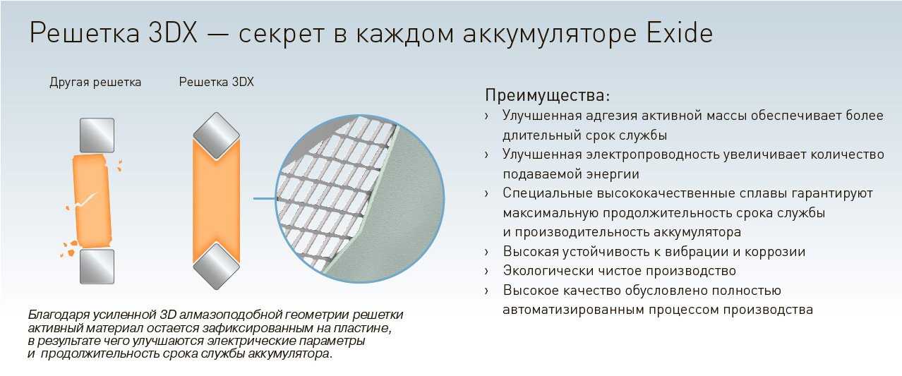 - Технология 3DX решетки. Благодаря своеобразной форме, активный материал остается зафиксированным на пластинах, благодаря чему улучшаются электрические параметры и продолжительность службы батареи.