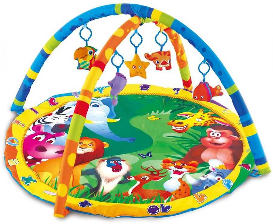 Детский коврик, оснащенный бортиками и дугой. В комплекте имеется 3 подвесные игрушки. Яркие картинки на текстиле понравятся детям как с первых месяцев жизни, так и постарше