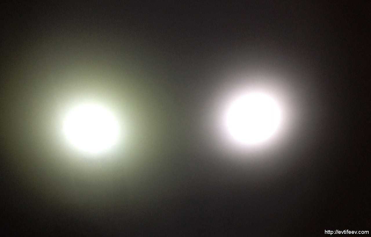В моём случае я пробовал два фонаря. Оба 1800 люменов. Один имеет одиночный светодиод 1800 люменов и рассчитан на большое пятно света, а второй имеет два светодиода по 900 люменов. Рассчитан на ближний и дальний свет (за которые отвечают разные светодиоды).