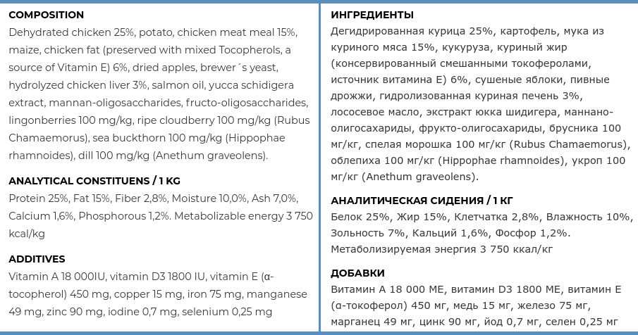 Рассмотрим состав корма PrimaDog на примере варианта «Adult All Breeds Chicken & Potato» (для взрослых собак всех пород, с курицей и картофелем). Для удобности чтения рекомендуем увеличить изображение кликнув по нему: