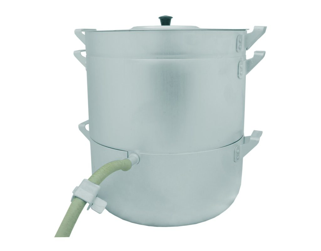 Корпус легковесный, всего 2.3 кг при диаметре 26 см. Закрывается герметично, исключая утечку пара. Каждый ярус оснащен ручками, это обеспечивает комфортное обслуживание. Через резиновый шланг с зажимом сливается готовый стерилизованный сок.