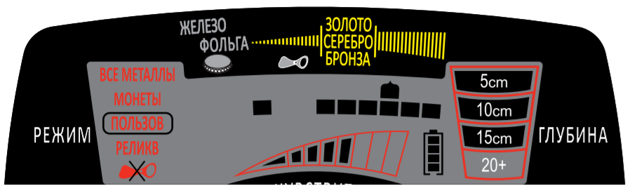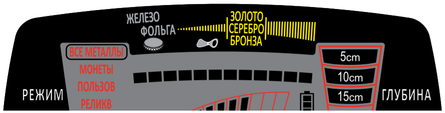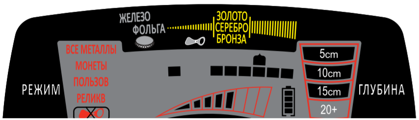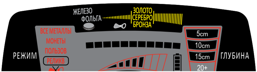 - 5 Режимов работы: все металлы, монеты, пользовательский, реликвии и режим отключающий металлический мусор(изображен как отрывная крышка от банки)