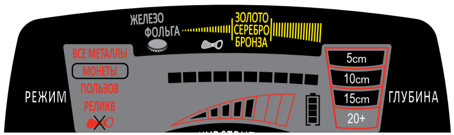 На дисплее детектора справа находится шкала, на которой указывается глубина залегания находки. Она имеет 4 значения 5 см, 10 см, 15 см, 20+ см. Чем глубже находится цель, тем больше столбиков будет закрашено.