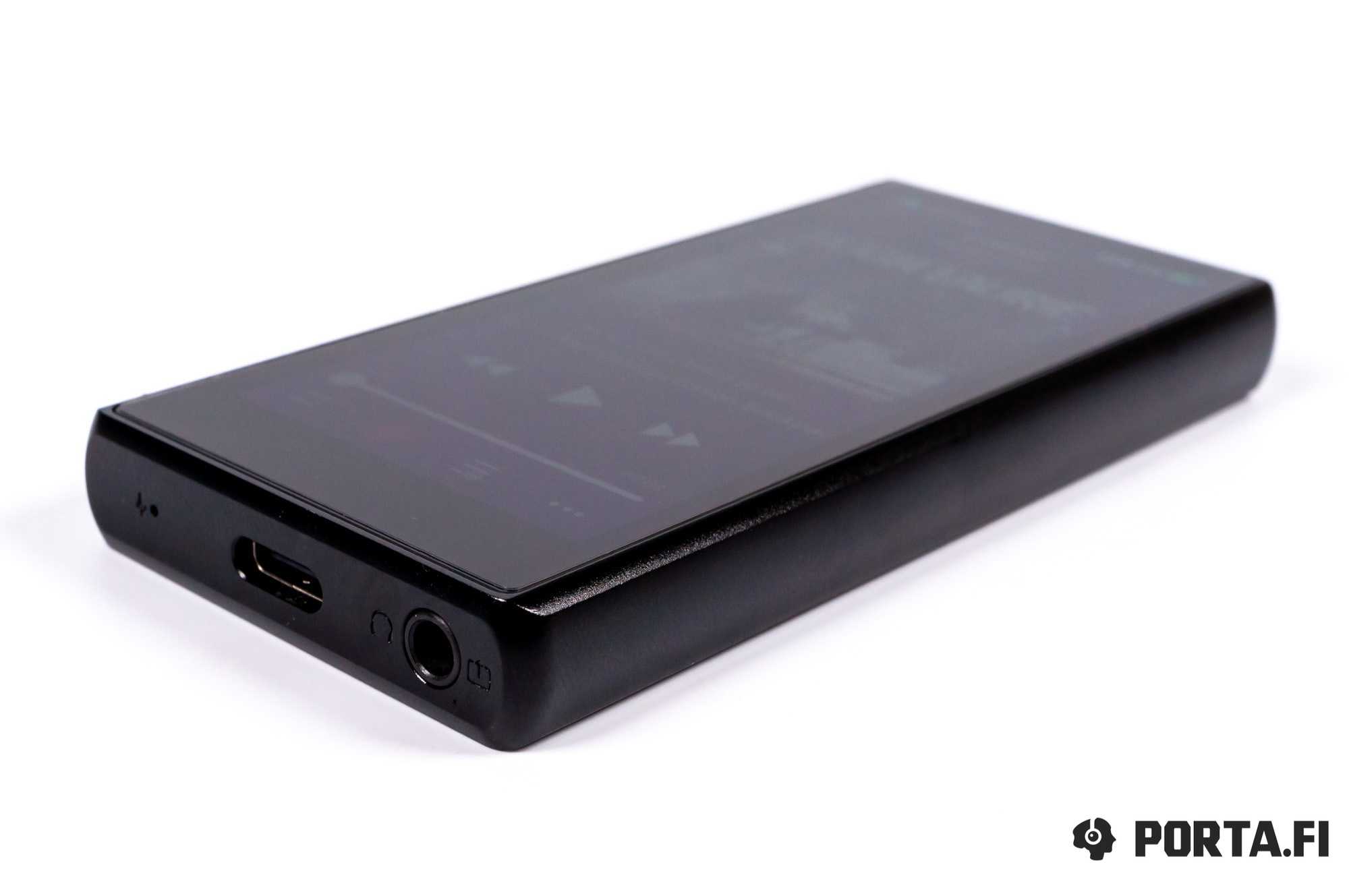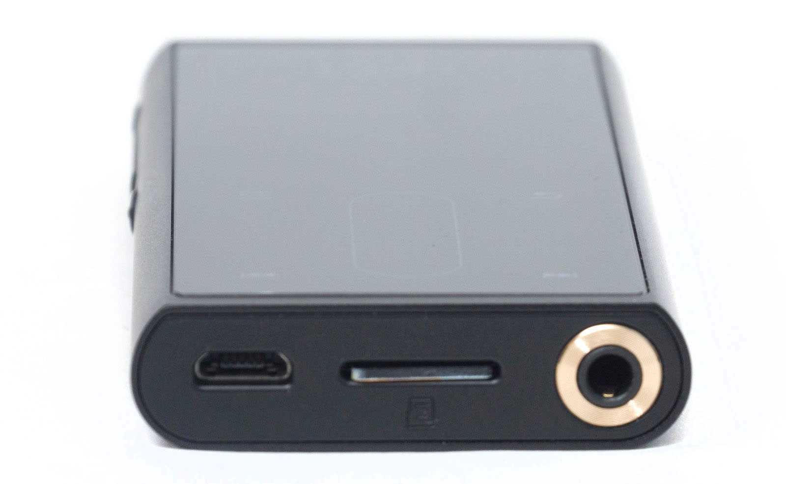 На верхней стороне находится почти незаметная решётка микрофона. На нижней — гнездо Micro-USB, слот для карточек памяти и выход на наушники. USB позволяет заряжать плеер, использовать его в роли карт-ридера или USB ЦАПа (впервые в бюджетной модели). Кстати, про зарядку, плеер отличается нереальным долгожительством, пара часов до полного заряда батареи, и часов 18-20, а то и больше, работы плеера — обеспечены.