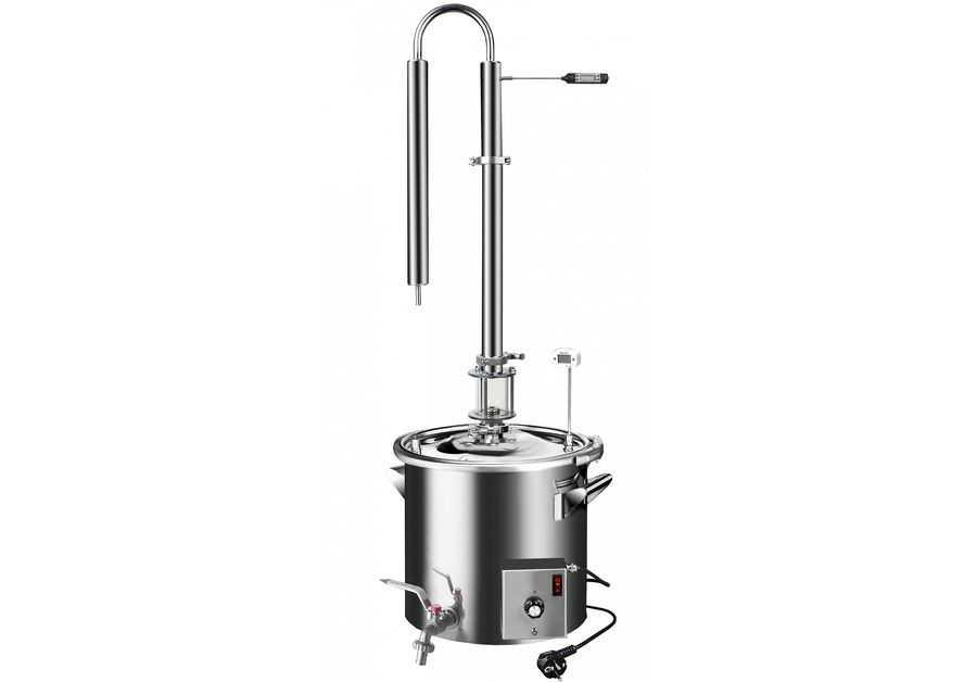 Цена – 11400 р, а если захотите емкость на 35 литров – то заплатите 15900р. Его универсальность и уникальность – в том, чтобы получать у себя на кухне как дистиллят, фруктовые водки, коньячные спирты, так и ректификат – чистый и крепкий, лишенный специфического «самогонного» запаха. При первом перегоне методом дистилляции скорость получения продукта – до 3 литров за час работы, при вторичной перегонке – уже до 6 литров за час.