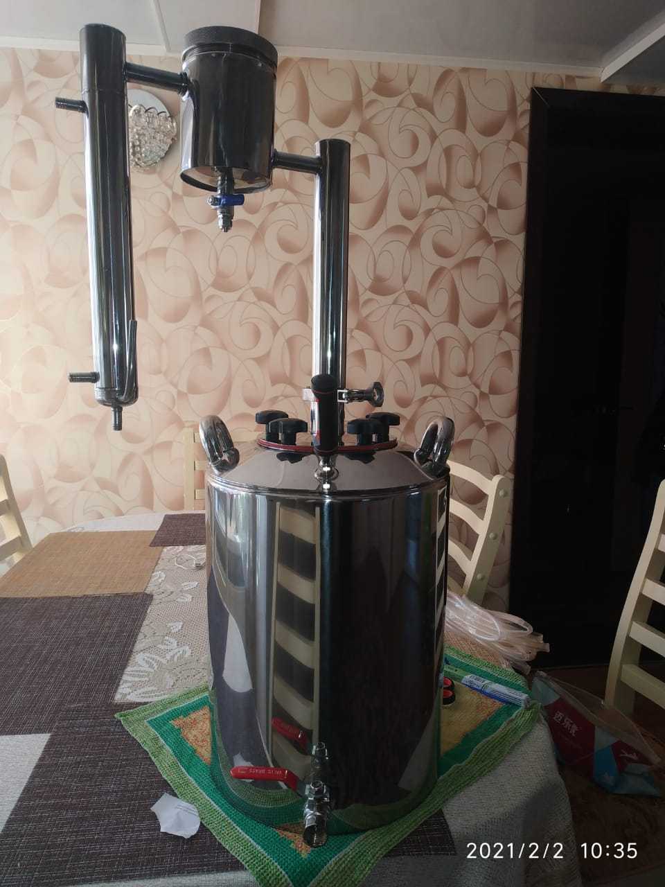 Это комфортный самогонный аппарат с некоторыми приятными улучшениями: сухопарник стал больше, холодильник мощнее, появился кран для слива барды и термометр теперь электрический. Также у него есть кламповое соединение, которое позволит нарастить высоту аппарата, поставить диоптр или же вообще воткнуть дефлегматор.