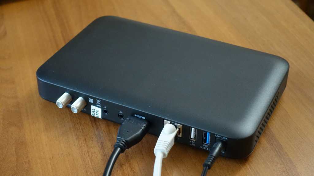 Из особенностей отмечу наличие слота для подключения смарт-карты условного доступа на правой боковой грани, а также тот факт, что изображение с приставки можно вывести не только на современный телевизор с цифровым входом HDMI, но и на телеприемник прежнего поколения с композитными интерфейсами — для этого предназначен AV-разъем и приобретаемый отдельно переходник mini jack—3×RCA. Расстояние между портами USB достаточное чтобы можно было без препятствий подсоединять флешки с крупным корпусом. К слову, самих портов USB два: один версии 2.0, другой — версии 3.0. При необходимости вы также сможете использовать выносной ИК-приемник, подключив его к соответствующему разъему на приставке.