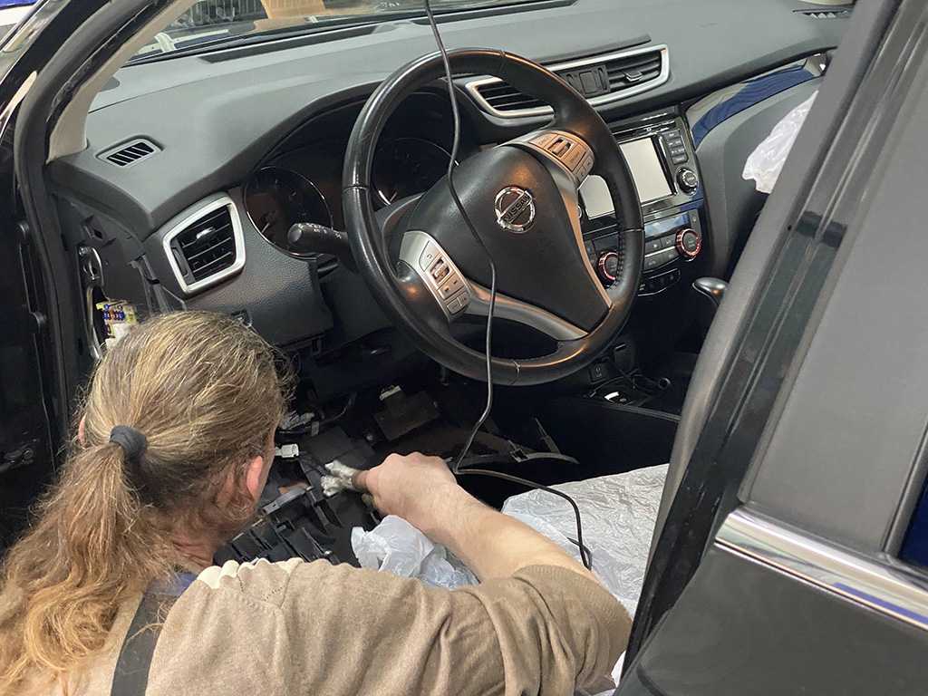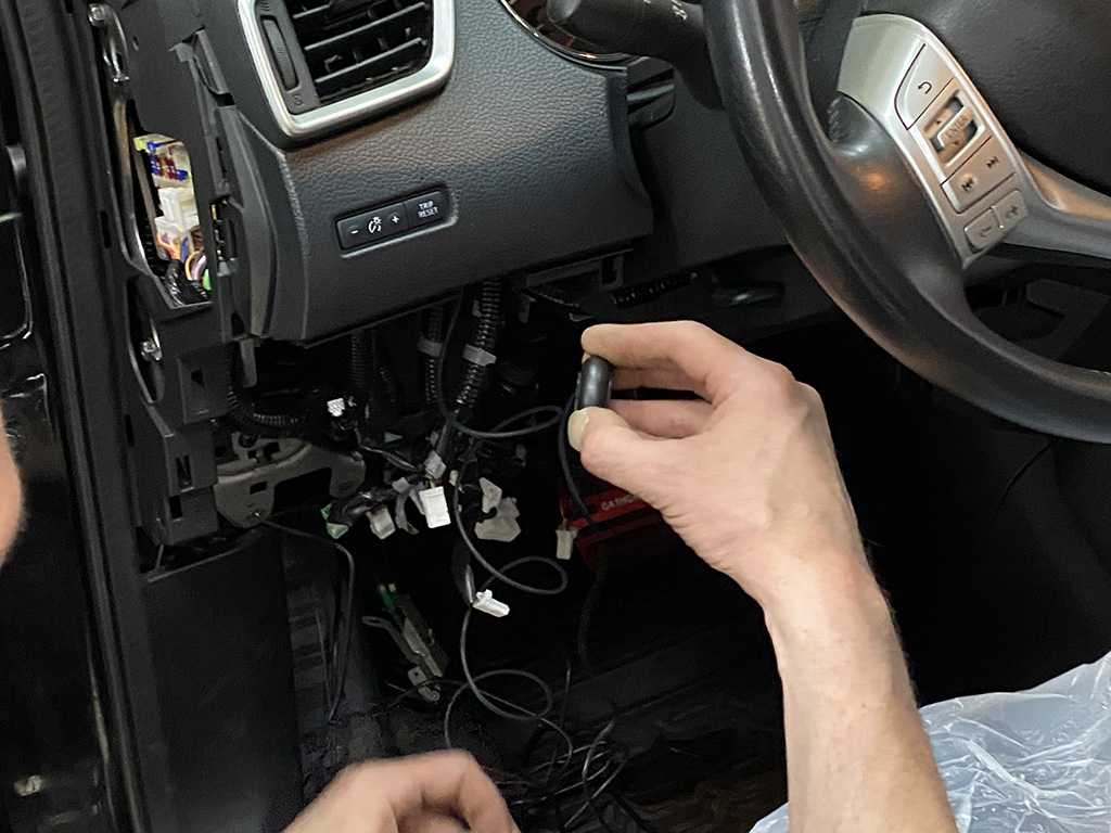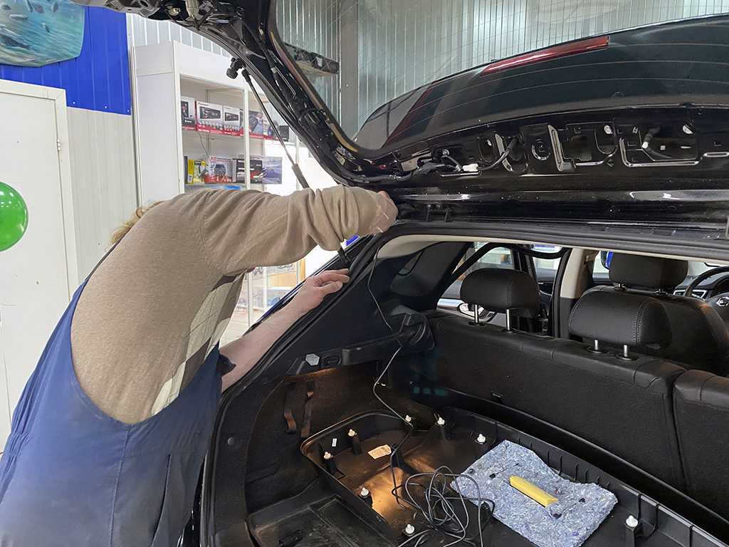 В заключение специалист установил обратно пластиковые накладки в багажнике, резинки на дверные проемы, аккуратно смотал провода под рулевой колонкой и закрыл кожух.
