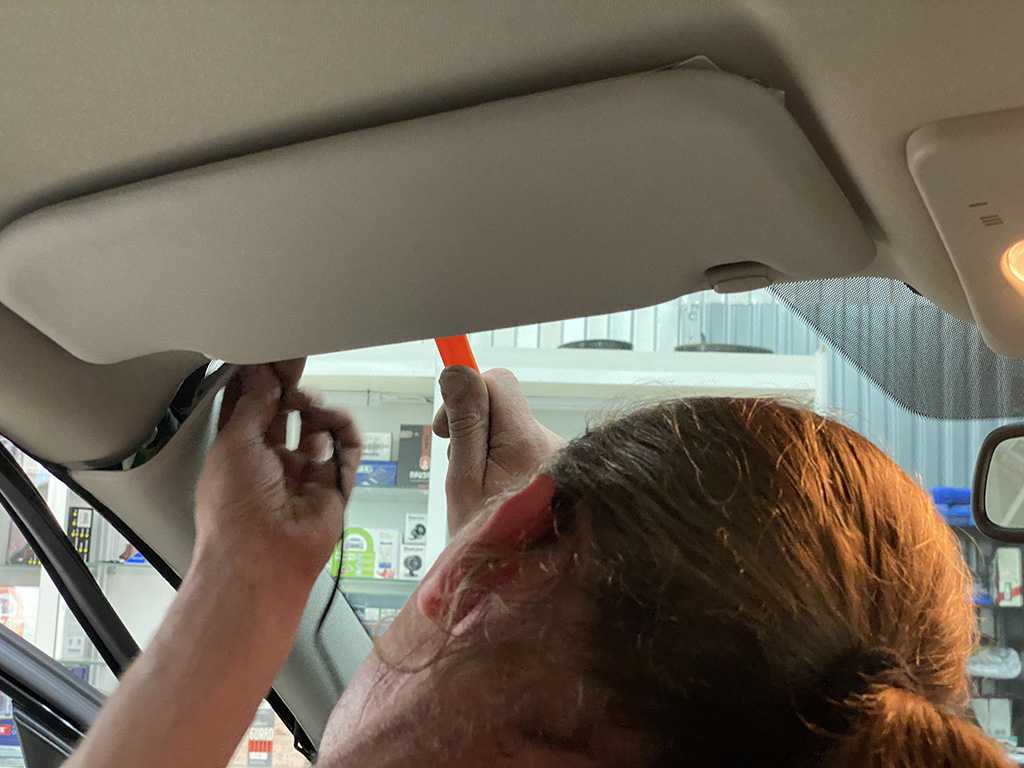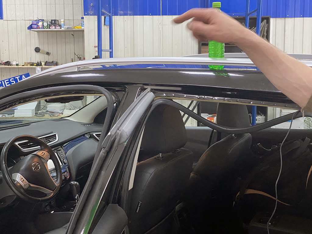 Сперва мастер снял пластиковую обшивку с багажника, приклеил заднюю камеру и начал тянуть провод через крышу с правой стороны.
